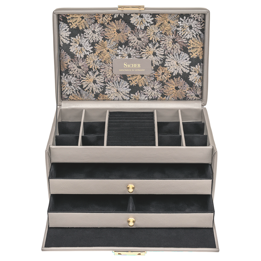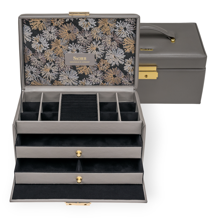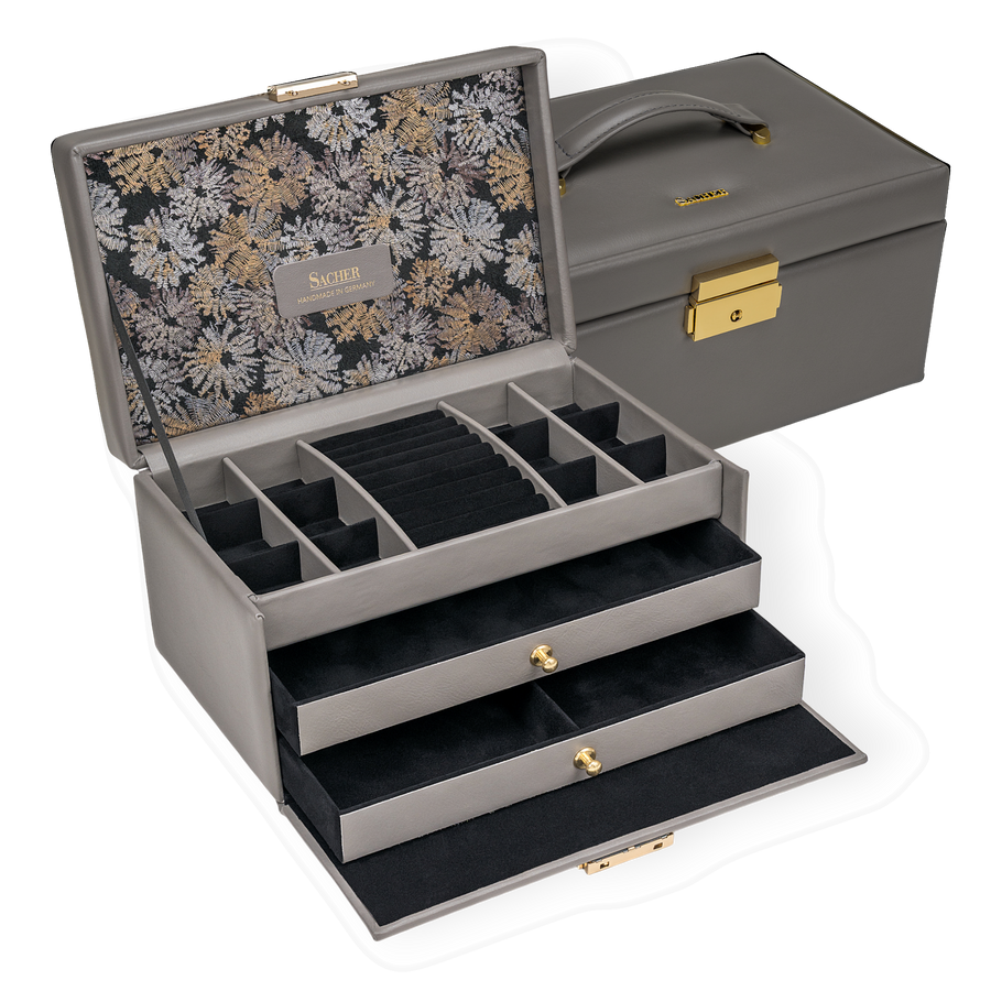 Les coffrets à bijoux de la collection FLEUR VENICE de SACHER séduisent par leur aspect exceptionnel et leurs opulents motifs floraux à l'intérieur. Qu'ils soient en véritable cuir de vachette italien, souple comme un gant, ou en similicuir végétalien, les deux matériaux savent enchanter.